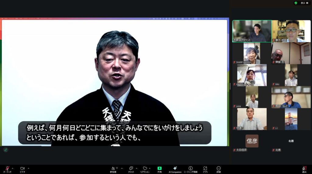 にをいがけオンラインミーティングは、zoomというアプリを使って、遠く離れた教友と励まし合いながらそれぞれの場所でにをいがけを行い、にをいがけから帰ってきた後にねりあいをするというイベント。