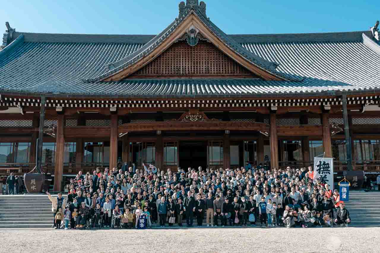 東礼拝場で参拝後、午後0時15分に布教部スタッフの案内で東礼拝場に参集。大教会長と共におつとめをさせていただき、東礼拝場前の石段で記念撮影を行いました。大教会長からは「年祭活動も残り1ヶ月あまり。それぞれが定めた思いをやり残しのないよう、最後まで実動して年祭の日を迎えていただきたい」とのお言葉をいただきました。