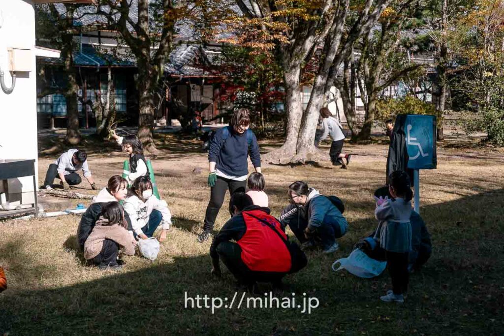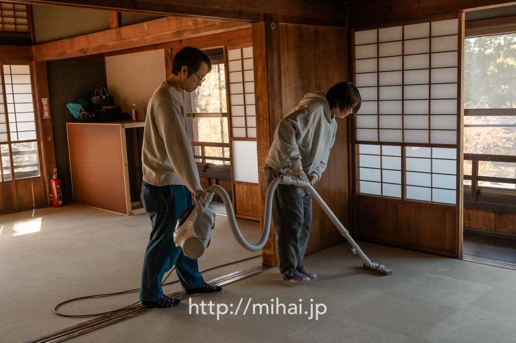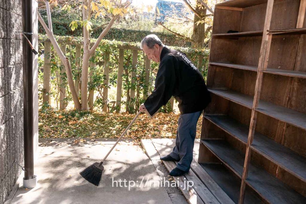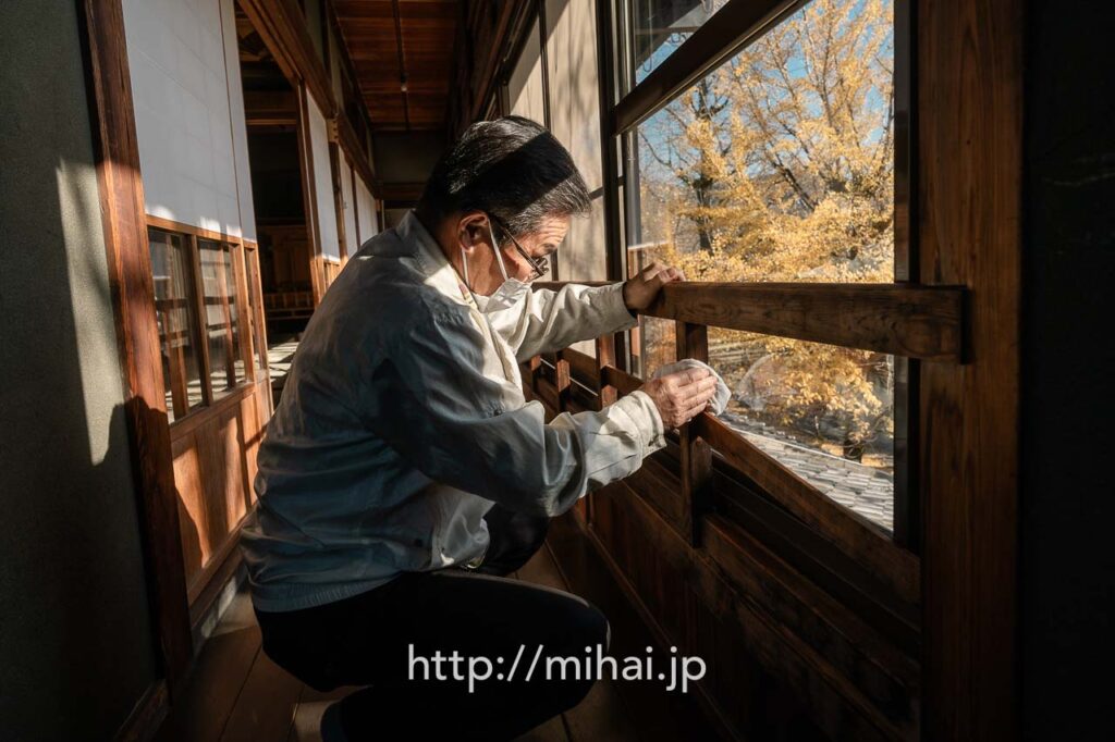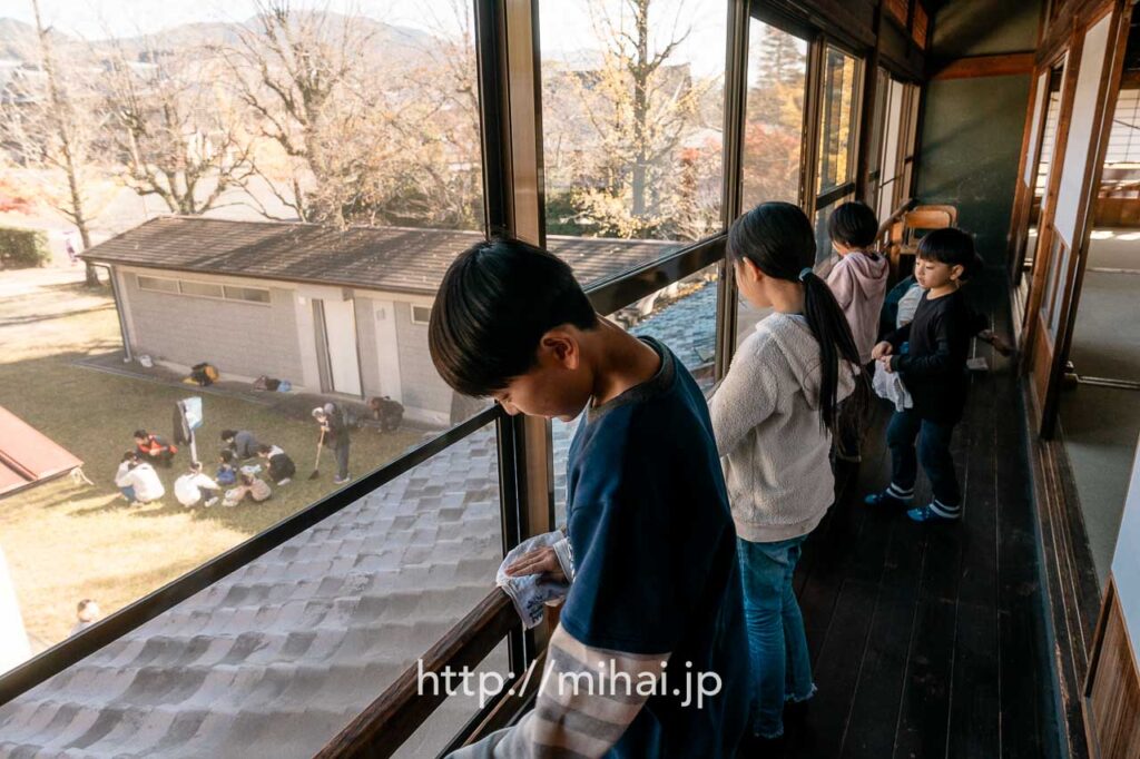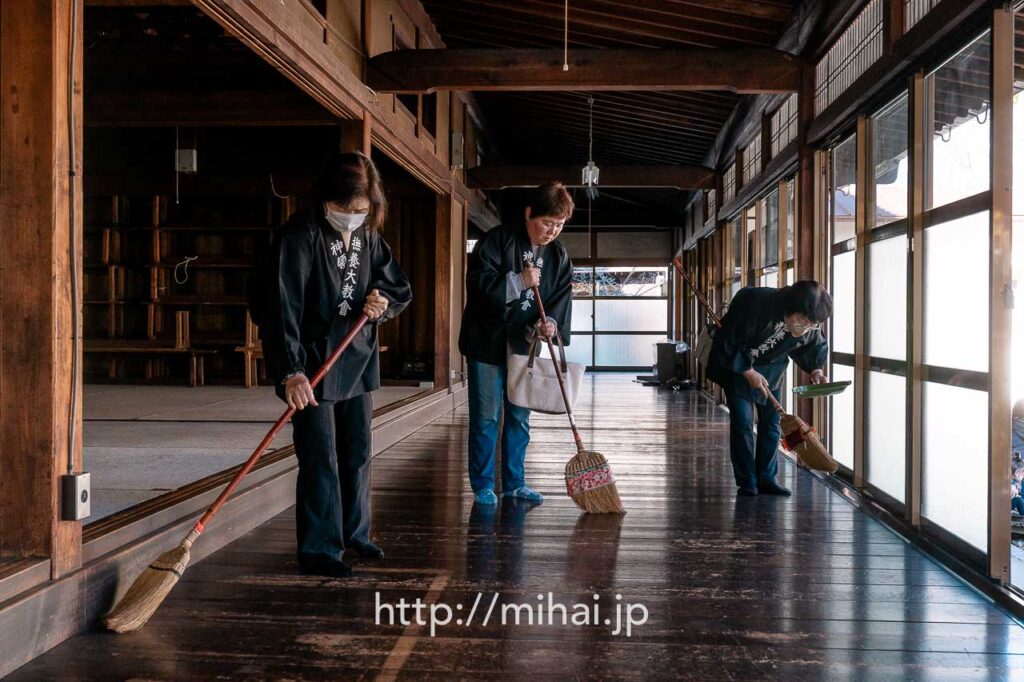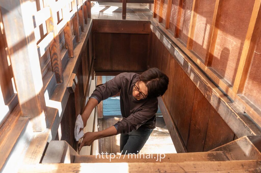 その後、別席を運ぶグループと、3ヶ所の現場でふせこみひのきしんをするグループに分かれて活動しました。美拝からは会長と共に旧本部詰所へ移動し、境内掛の指示のもと、館内の清掃ひのきしんをさせていただきました。雨戸を開け、1階と2階に分かれて清掃作業を実施。窓ガラスや窓枠を拭くと雑巾が真っ黒になり、大きな達成感を味わわせていただきました。