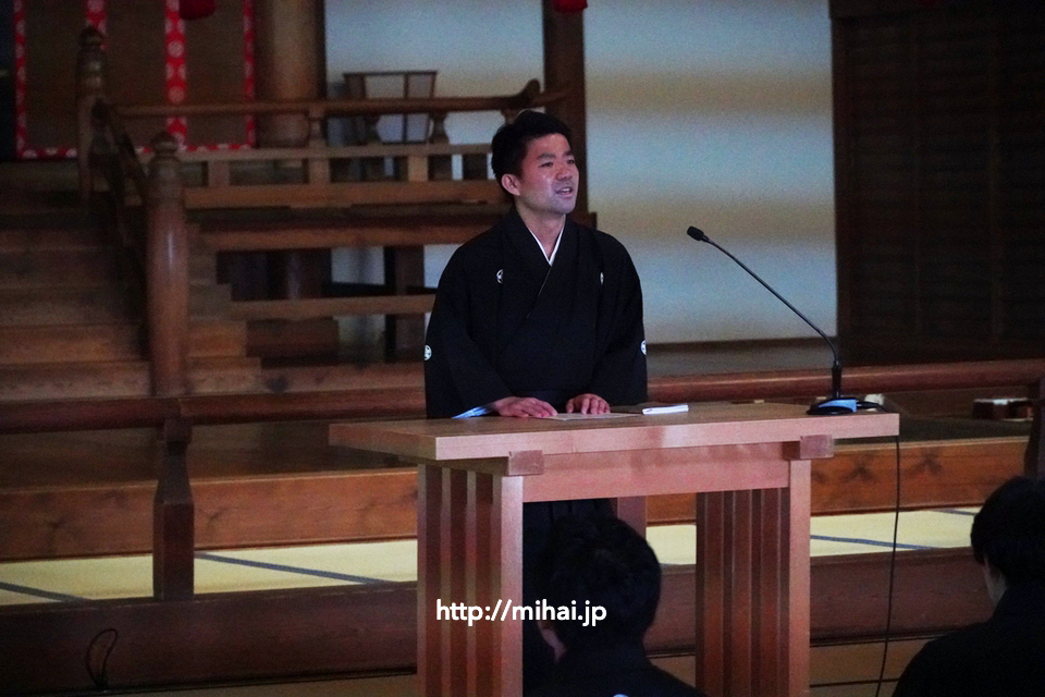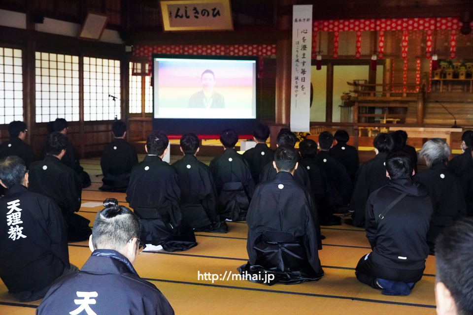 式典では、中山大亮青年会長様より映像を通して御告辞を賜りました。「布教と求道の研鑽を胸に、各地でつらい境遇に心が倒れそうな中でも、自分を見つめ直す心を忘れず、ともに歩みを進めていきたい」とのお言葉を心におさめました。続いて、大教会長様よりご祝辞を賜り、齋藤俊行委員長の挨拶、首府分会の天満恵一さんによる会員代表決意表明がありました。式典は、あらきとうりょうの更なる躍進を誓い、あらきとうりょう指針唱和・青年会歌斉唱をもって締めくくられました。