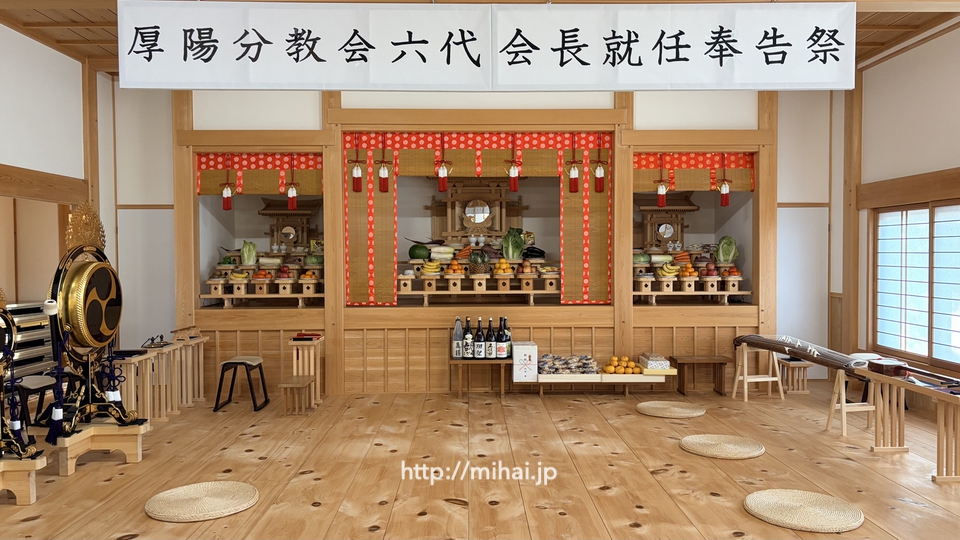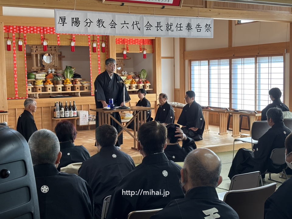 12月7日(日)、山口県の美拝の部内教会・厚陽分教会において、壱岐淳平新会長の六代会長就任奉告祭が執り行われました。撫養大教会長様にご執行いただき、多くの教友の皆さんが新会長の門出を祝うために集まってくださいました。