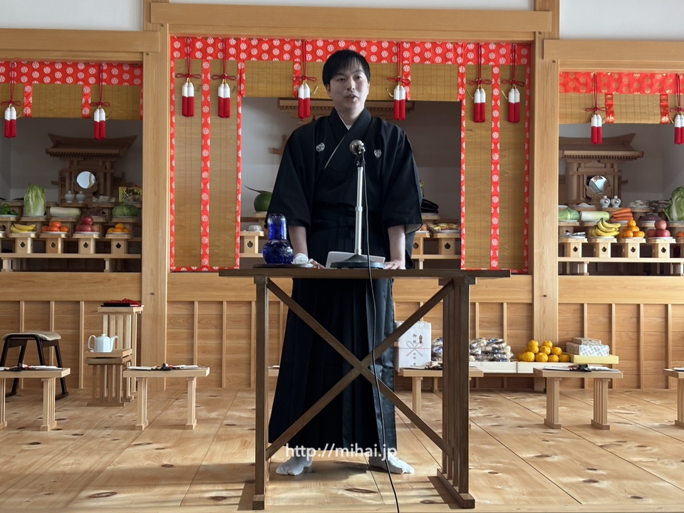 祭文の中で壱岐淳平新会長は、会長としての心構えを誓われました。「我を出さず、教えに沿って皆が治るように努める」。そして「頭を低く物腰柔らかく、志を高く持つ」。謙虚でありながら高い志を持ち、信者の皆さんと共に成人の道を歩んでいく、その強い決意が伝わってくる奏上でした。