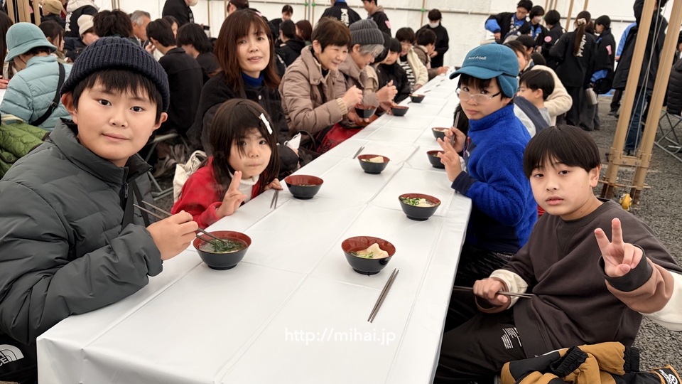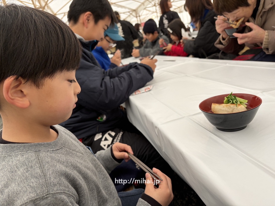 案内された席に着くと、婦人会や学生のひのきしんの方々が、心を込めてお雑煮を運んでくださいました。今年も変わらぬ味わいのお雑煮を、感謝しながらいただき、おかわりをする方も多く見られました。ひのきしんの姿と温かいお雑煮に、身も心もほっと和らぐ時間でした。